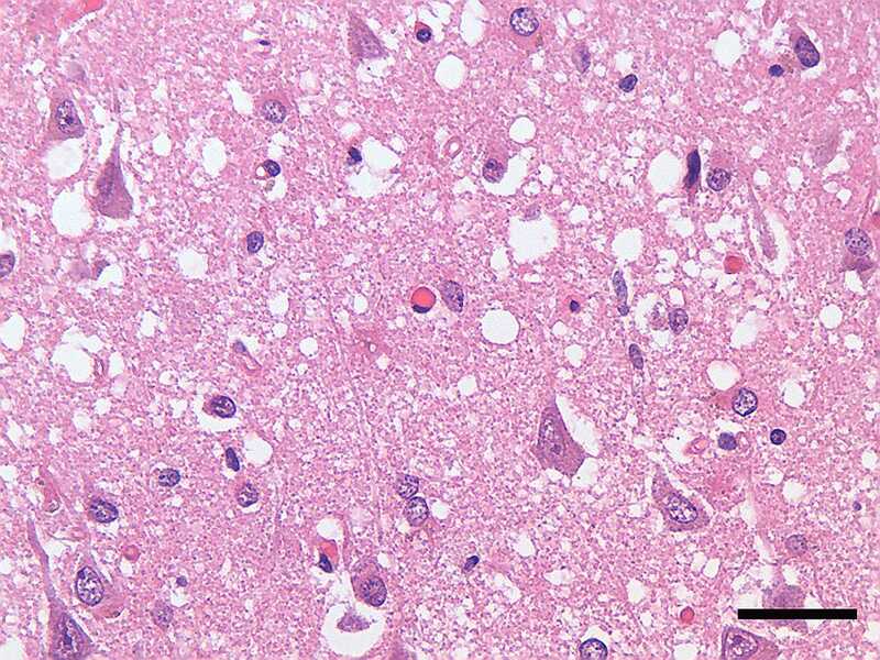 Нейродегенерация, вызванная прионами, на микрофотографии среза коры головного мозга человека, умершего от болезни Крейтцфельда—Якоба.Credit: