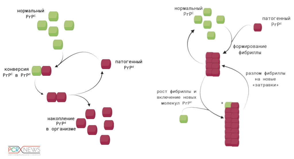 По наиболее распространенной гипотезе, молекулы PrPd способны катализировать переход нормального белка в прионную форму. Предложено несколько моделей, объясняющих детали этого механизма, но суть сводится к одному — аномально свернутая молекула (одна или в составе фибриллы) взаимодействует с нормальным белком, который при этом изменяет конформацию и превращается в инфекционную, гораздо более стабильную форму. Как раз из-за ее высокой стабильности процесс однонаправленный — нормальный прионный белок не может катализировать обратный переход PrPd в безопасную неинфекционную форму. Поэтому патогенный вариант белка накапливаются в клетке экспоненциально.