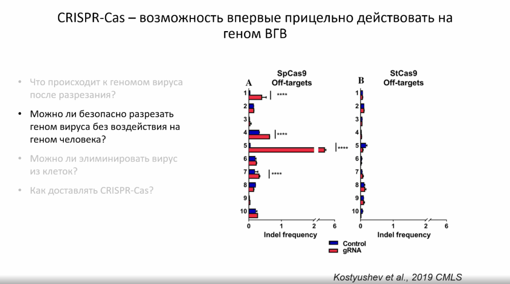 Другая проблема CRISPR-Cas — возможное нецелевое действие. Как и в любой терапии, необходимо направленно воздействовать именно на геном вируса, не затрагивая геном человека. Вирус гепатита B частично интегрируется в геном человека, в этом случае система CRISPR/Cas может разрезать и геном пациента.