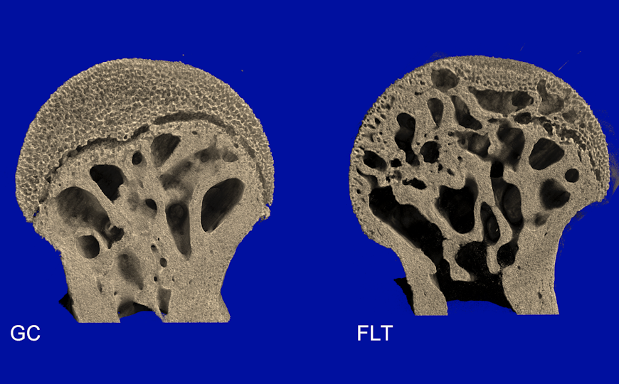 Костная и хрящевая ткань в головке бедренной кости мыши, побывавшей на околоземной орбите (FLT), отличается от оставшегося на Земле контроля (GC). Хрящевая ткань подвергается преждевременному вторичному окостенению в условиях микрогравитации.