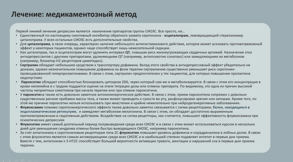 Первая линия лечения депрессии — назначение СИОЗС. Самый нейтральный препарат этой группы — эсциталопрам, который обладает высокой селективностью и меньшим количеством побочных эффектов, чем другие. Другие СИОЗС имеют разнообразную специфику действия.
