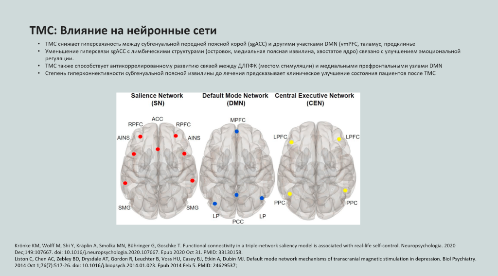 Считается, что ТМС повышает доступность серотонинергических и дофаминергических рецепторов, увеличивает выработку BDNF и позволяет перестроить активность нейрональных сетей, повысив активность гипофункциональных отделов мозга или снизив гиперконнективность между теми или иными структурами. Интересно, что реактивность на ТМС тоже различается у разных пациентов. Например, у пациентов с распространенным однонуклеотидным полиморфизмом Val66Met в гене BDNF реакция на ТМС снижена или вовсе отсутствует.