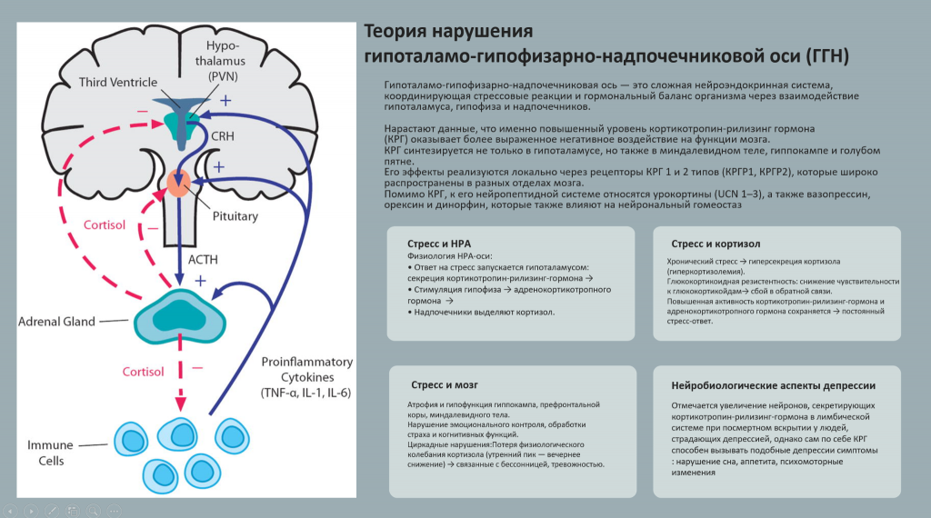 Следующая теория состоит в том, что при депрессии нарушается гипоталамо-гипофизарно-надпочечниковая ось (ГГН) — нейроэндокринная система, координирующая реакции на стресс. В процессе работы этой оси из гипоталамуса выделяется кортикотропин-рилизинг гормон (КРГ), который стимулирует гипофиз, и он вырабатывает аденокортикотропные гормоны. В результате кора надпочечников производит глюкокортикоиды, в том числе кортизол, часто называемый «гормоном стресса». При длительном стрессе чувствительность к кортизолу снижается, поэтому он вырабатывается более активно. Ресурсы организма истощаются, и возникает депрессия, а также соматические расстройства. Действительно, у людей с длительной депрессией повышается уровень рецепторов к КРГ.