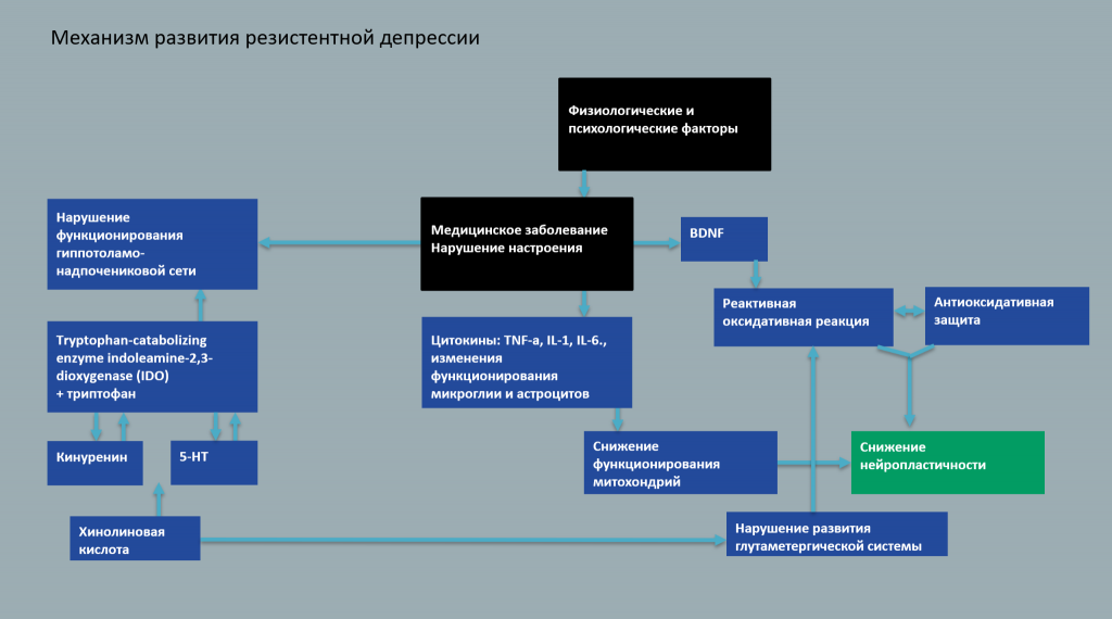 Развитию резистентной депрессии способствуют все ранее упомянутые механизмы. Даже если до этого болезнь сопровождалась нарушениями только со стороны одной системы, при резистентной депрессии эти нарушения усугубляются, накладываясь друг на друга.