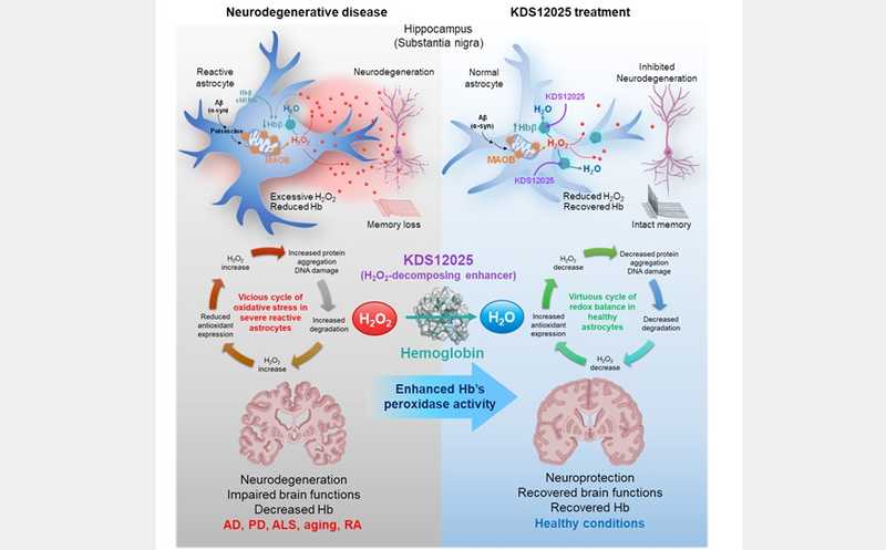 Гемоглобин не только переносит кислород и диоксид углерода в крови. Он также содержится в мозге, в первую очередь в астроцитах, где снижает уровень перекиси водорода благодаря своей псевдопероксидазной активности. При нейродегенеративных заболеваниях уровни гемоглобина снижаются, окислительный стресс растет. Ученые из Южной Кореи синтезировали соединение KDS12025, которое связывает гемоглобин в астроцитах и усиливает его антиоксидазную активность. У мышиных моделей болезни Альцгеймера, Паркинсона и БАС KDS12025 восстанавливало содержание гемоглобина и улучшало состояние животных. Более того, это соединение продлило жизнь мышам при долгосрочном воздействии без выраженных побочных эффектов.