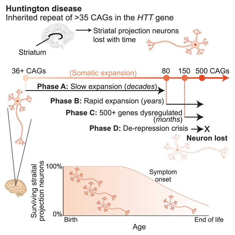 У пациентов с болезнью Гентингтона нейроны полосатого тела наиболее уязвимы; в них происходит соматическая экспансия повторов. Авторы исследования, которое недавно было опубликовано в Cell, обнаружили, что число повторов в гене нейрона за десятилетия его жизни может увеличиться на порядок (с 40–45 до 100–500+), причем белок становится токсичным при 150 CAG и более — мутации с меньшим количеством повторов остаются «биологически тихими». Динамика этого процесса соответствует долгому латентному периоду и быстрому прогрессированию болезни. Это явление приводит к соматическому мозаицизму (различию числа повторов в разных типах клеток у одного пациента). В клетках, которые, подобно нейронам, не делятся, изменения длины повторов могут возникнуть при случайном смещении нитей во время транскрипции или дестабилизации двойной спирали, с последующим неправильным спариванием и репарацией, восстанавливающей комплементарность. Почему соматическая нестабильность гена гентингтина особенно сильно выражена в нейронах определенного типа, пока неясно.