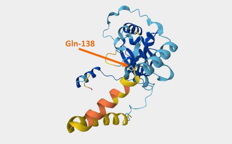 Триацилглицеролсинтаза Tgs3 M. tuberculosis. Стрелкой показан кодон 138 (глутамин). В результате мутации он заменяется стоп-кодоном, что приводит к продукции укороченного варианта белка