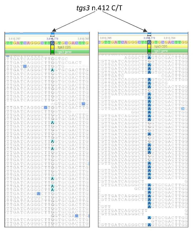Картирование коротких нуклеотидных прочтений полногеномного секвенирования на геном референс-штамма H37Rv. Показан фрагмент последовательности гена tgs3 с мутацией в кодоне 138 Gln>Stop (CAA>TAA) (мутантная позиция в геноме 3610778 G>A показана стрелками). Слева исходный штамм 396, справа изолят из легких мыши после 5,5 месяцев лечения. Credit: Игорь Мокроусов