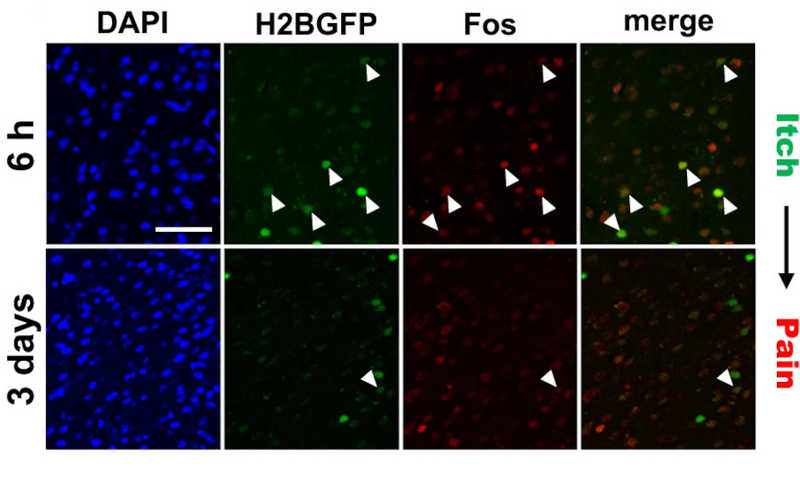 Мышам вводили гистамин, а через шесть часов или трое суток проводили повторную инъекцию гистамина или заменяли его формалином. У мышей, получавших разные стимулы (сначала гистамин, затем формалин) доля нейронов, активировавшихся в ответ на оба раздражителя была значимо выше случайной, если промежуток между инъекциями составлял 6 часов. Напротив, при интервале в три дня доля таких нейронов была неотличима от случайной. Иными словами, в передней поясной коре обнаружилась популяция нейронов, активируемых как болью, так и зудом, которые следуют друг за другом в коротком временном промежутке. Если же стимулы были одинаковыми (две инъекции гистамина), уровень активации не зависел от интервала между ними.