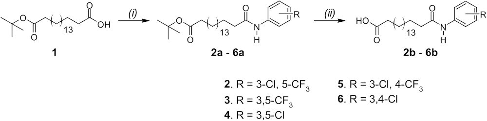 Ученые задались целью создать мягкий разобщитель, который бы слабо снижал протонный градиент и не нарушал синтез АТФ. Руководствуясь тем, что жирные кислоты с арилмочевинными заместителями обладают выраженными разобщающими свойствами (однако также токсичны для клеток), они синтезировали их структурные аналоги — ариламидные жирные кислоты. Всего было получено пять структур — три 3,5-замещенных, обозначенных как 2b, 3b и 4b, и две 3,4-замещенных, обозначенных как 5b и 6b.