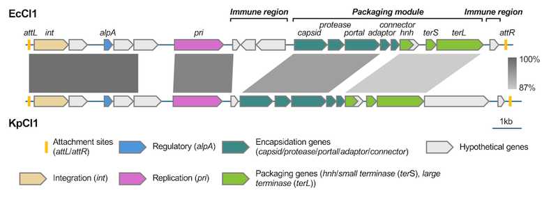Анализируя cf-PICI, исследователи обратили внимание, что один из этих элементов (EcCIGN02175, или EcCI1) встречался в пяти родах и семи видах: Escherichia coli, Klebsiella pneumoniae, Shigella flexneri, Citrobacter freundii, Citrobacter amalonaticus, Enterobacter asburiae и Enterobacter hormaechei. Сравнение состава EcCI1 выявило четыре вариабельных региона: два фланкирующих оперона, которые кодировали гены для формирования капсида cf-PICI, и вероятно, антифаговые системы; один ниже по течению от alpA, с неизвестной функцией; и один внутри упаковочного модуля, содержащий гены для хвостового коннектора и адапторных белков. Крайне похожей структурой обладал KpCI1, обнаруженный у K. pneumoniae.