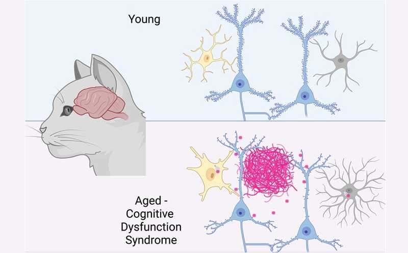 В мозге пожилых или пораженных СКД кошек были выявлены патологии, сопоставимые с наблюдаемыми при болезни Альцгеймера (БА) у человека, включая атрофию мозга, потерю нейронов, бляшки бета-амилоида, тау-патологию и сосудистые заболевания, такие как церебральная амилоидная ангиопатия. Однако до сих пор неясно, просто ли бета-амилоид накапливается с возрастом или способствует нейродегенерации, в частности, дегенерации синапсов, и развитию симптомов СКД. Также не до конца понятна роль глии. Исследователи из Великобритании прояснили эти вопросы, а также узнали, могут ли кошки с СКД быть моделью БА у человека.