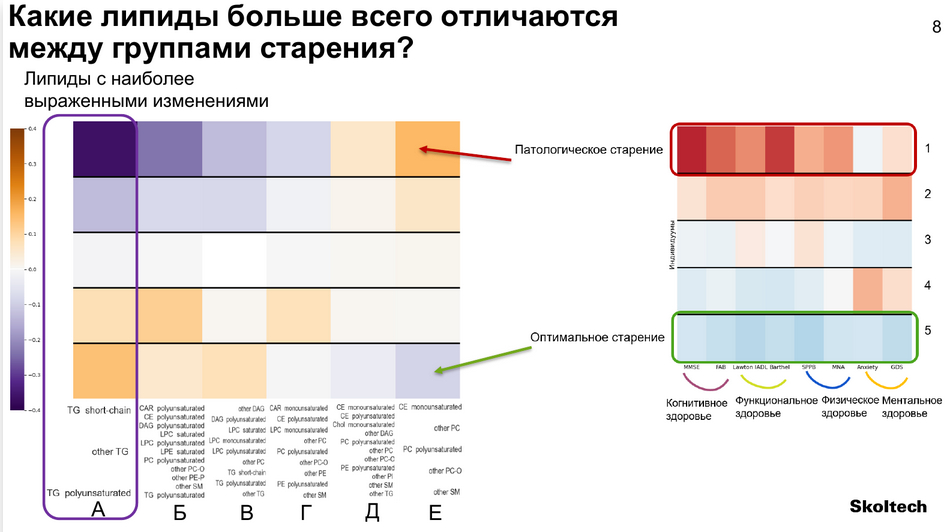 Самые выраженные и самые интересные, по словам докладчицы, различия также отмечались среди короткоцепочечных и полиненасыщенных триацилглицеридов. Выявленные различия, сопоставленные с данными комплексной гериатрической оценки, позволяют разделить группы старения по липидному профилю, что в перспективе позволит предсказывать общую динамику возрастных изменений.