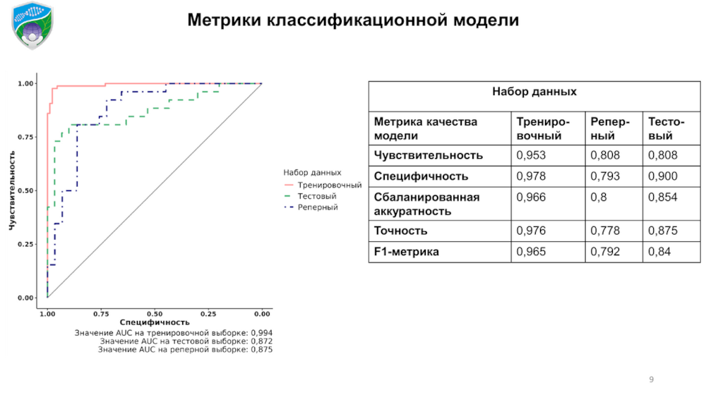 Далее авторы применили метод метамоделирования — они проводили анализ при помощи целого набора моделей, а полученные предсказания объединяли в матрицу, на основании которой затем формировали модели второго этапа и проводили построение классификатора. Его точность, то есть площадь под ROC-кривой, составила 0,87 на тестовой и реперной выборках и 0,99 — на тренировочной.