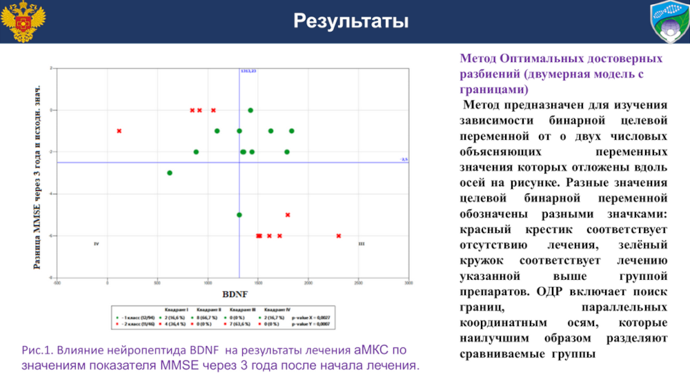 Фактор BDNF, который по результатам исследования оказался ключевым, играл значимую роль только в контексте двух препаратов — мексидол и актовегин. Анализ двумерных закономерностей для пар из биохимического показателя и оценки психического состояния показал, что при низком уровне этого фактора никакой разницы между группами получавших и не получавших лечение пациентов нет. Но если уровень BDNF превышает определенное пороговое значение, психическое состояние нелеченных пациентов значительно хуже, чем получавших лечение. Этот эффект прослеживается практически на всем интервале наблюдений. Всего же из 30 проанализированных взаимосвязей статистически значимыми оказались 13.
