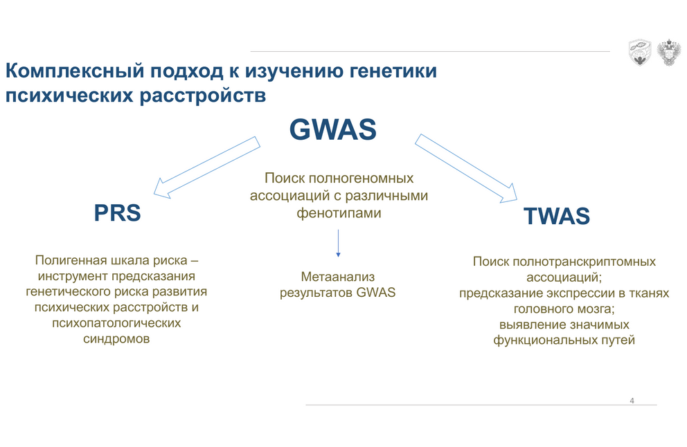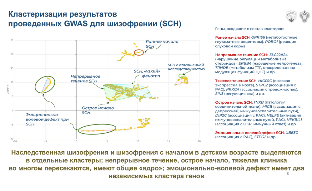 Полногеномное секвенирование всех участников с 30-кратным покрытием и GWAS для узкого фенотипа шизофрении выявил 87 значимых полиморфизмов. В дополнение к узкому фенотипу аналогичным образом проанализировали другие однородные выборки. Кластеризация полученных данных с применением алгоритма UMAP показала, что наследственная шизофрения с началом в детском возрасте представляет собой отдельную группу с неким общим генетическим «ядром». Аналогичные результаты — общее «ядро» для определенных проявлений — были получены при анализе психопаталогических синдромов, таких как бредовые состояния или суицидальное поведение.