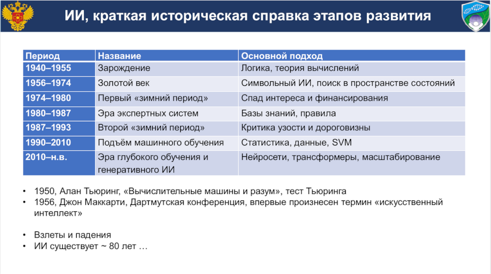 В заключение докладчик приводит цитату Игоря Анатольевича Соколова, академика РАН и декана факультета ВМК МГУ: «ИИ имеет две ключевые характеристики: во-первых, он не искусственный, а во-вторых — он не интеллект».