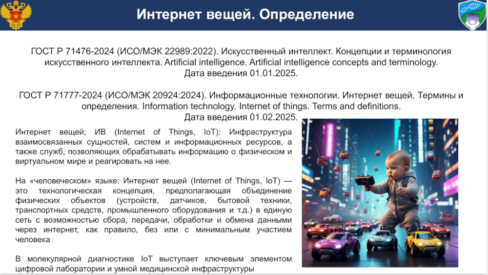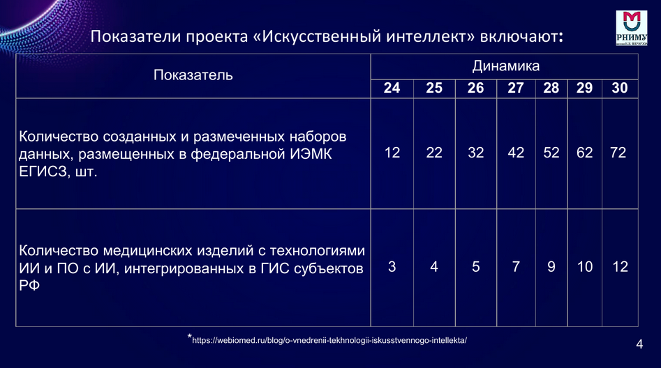 Цифровая трансформация, о которой говорилось в предыдущем докладе, — это качественное, а не количественное преобразование нынешней ситуации. Для решения ее задач утверждено стратегическое направление в области цифровой трансформации до 2030 года и проект «Искусственный интеллект». Этот проект имеет два основных показателя. Первый из них — количество созданных и размеченных наборов данных для ИИ, которое предполагается увеличить с 12 (на 2024-й год) до 72 к 2030-му году. Второй — количество медицинских изделий с технологиями ИИ, интегрированных в клиническую практику (в 2024 году их было зарегистрировано три).