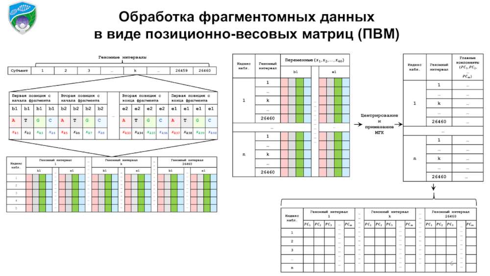 Для анализа геном разделили на неперекрывающиеся окна протяженностью 100 килобаз, на которые картировали полученные фрагментомные данные, в первую очередь концевые участки. Анализируемые фрагменты представили в виде позиционно-весовых матриц (ПВМ).
