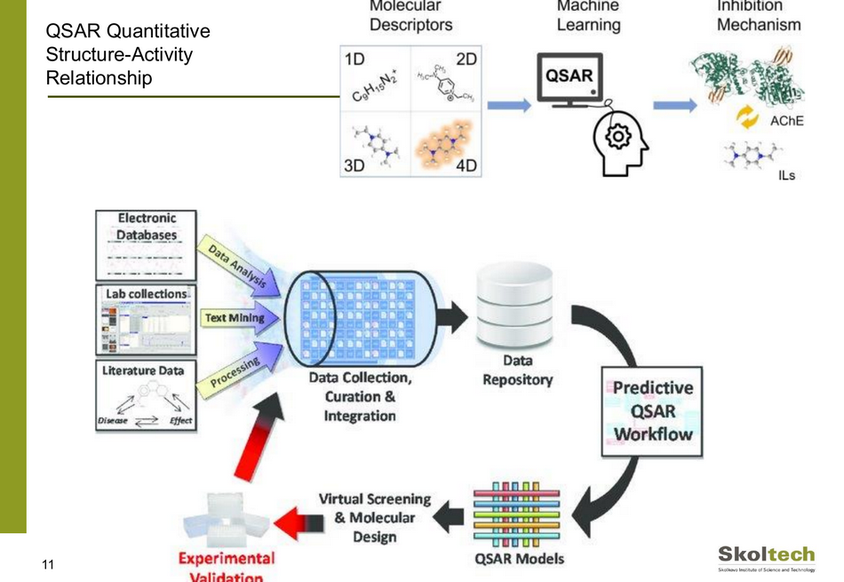 Однако все современные методы машинного обучения опираются на векторные данные, и возникает вопрос, как представить молекулу в виде вектора. Для этого существует определенное количество способов, и надо сказать, что эти подходы не новы. Один из примеров — QSAR, с помощью которого пытаются предсказывать медицинские свойства препарата по его химической структуре и уже полученным экспериментальным данным.