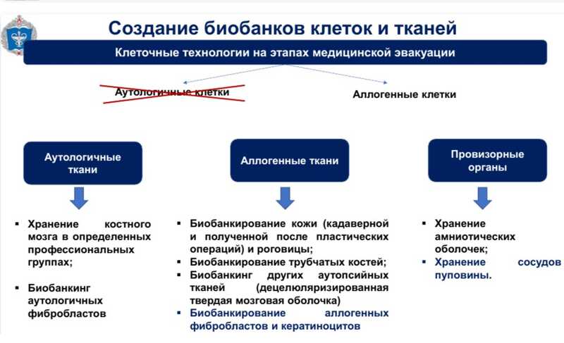 Существует представление о том, что банки персонифицированных клеточных культур военнослужащих могут помочь как в лечении самих доноров клеток, так и в лечении других людей. Но использование аутологичных клеток не слишком реально организовать в настоящее время, подходы, основанный на аллогенных клетках, представляются более перспективными.