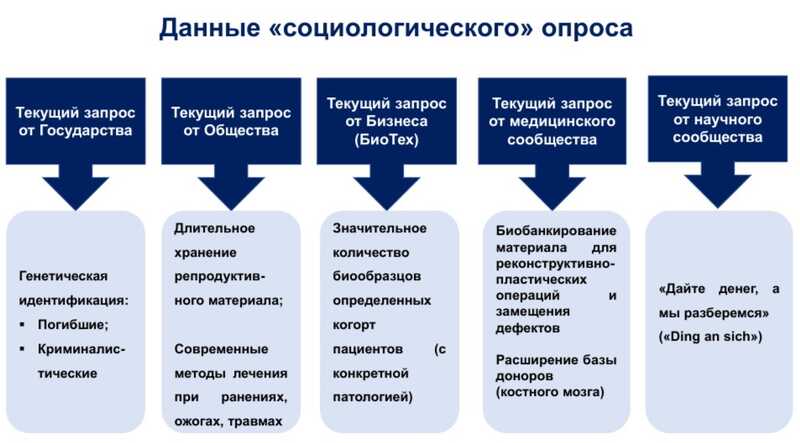 Существуют запросы на работу с биобанками, как от государства и общества, так и от специалистов в различных областях. Легко видеть, что эти запросы пересекаются, и возможно формирование консорциумов для решения сразу нескольких задач. Например, вопросы генетической идентификации граждан можно совместить с расширением базы доноров и длительным хранением репродуктивного материала.