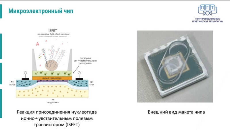 Принцип действия прибора — регистрация изменения рН во время присоединения нуклеотида ионно-чувствительным полевым транзистором (ISFET).