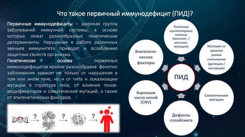 Первичные иммунные дефициты (ПИД) — широкая группа заболеваний, связанных с нарушением различных звеньев иммунитета и вызванных разнообразными генетическими факторами.