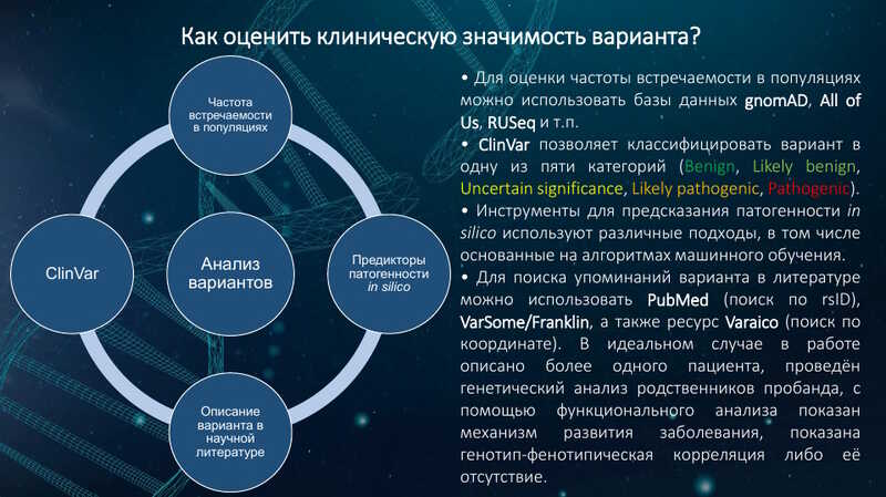 Результатом биоинформатической обработки данных секвенирования является приоритизация обнаруженных генетических вариантов с использованием различных баз данных и предикторов патогенности.
