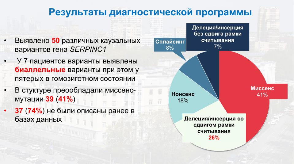 К настоящему времени на диагностику было направлено 195 пациентов в возрасте от 2 месяцев до 63 лет. Из них у 89 человек выявили каузальные варианты в гене SERPINC1, эти пациенты были из 71 неродственной семьи. Очень важно, что диагностика выявила патологию у 39 детей — при раннем выявлении выше шанс предотвратить развитие патологического тромба.