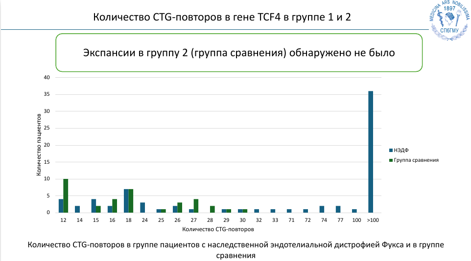 Чтобы оценить распространенность этого явления в российской популяции, сотрудники НИЦ молекулярной медицины проанализировали группу пациентов, которым по данным биомикроскопии глаза был поставлен диагноз НЭДФ. В контрольную группу включили пациентов с катарактой, которая отличается по патогенезу. И действительно, в группе с НЭДФ у 60% больных выявили экспансию повторов в гене TCF4, но их не обнаружилось ни у одного участника с катарактой. Эти результаты сопоставимы с зарубежными данными, согласно которым экспансии TCF4 встречаются примерно у 70% людей с НЭДФ. Этот клинический пример подчеркивает, что экспансионных заболеваний, скорее всего, намного больше, чем считается.