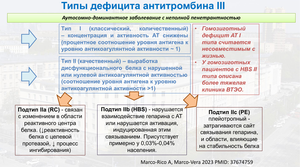 Существует два типа дефицита антитромбина III. Первый из них — количественный, при котором снижена концентрация этого белка и из-за этого снижена антитромбиновая активность. Гомозиготный дефицит антитромбина первого типа считается несовместимым с жизнью.