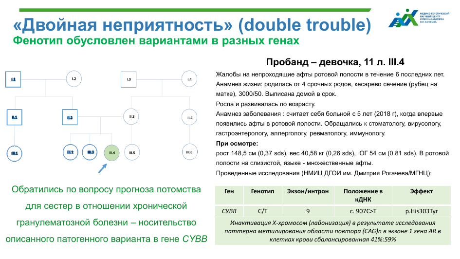 Девочка — гетерозиготная носительница варианта в гене CYBB, связанного с иммунодефицитом, имела легкие проявления заболевания. Семья обратилась за диагностикой носительства X-сцепленного иммунодефицита, когда сестры пробанда планировали беременность. Однако на приеме у сестер обнаружились аномалии кистей и стоп, такие же аномалии были выявлены у их отца. При полногеномном секвенировании оказалось, что у отца и у одной из сестер причиной этих аномалий являются гетерозиготные варианты в гене ROR2, а у еще одной сестры — мутация в гене TP63. При этом носительства иммунодефицита, за диагностикой которого семья обратилась изначально, больше ни у кого не было выявлено.