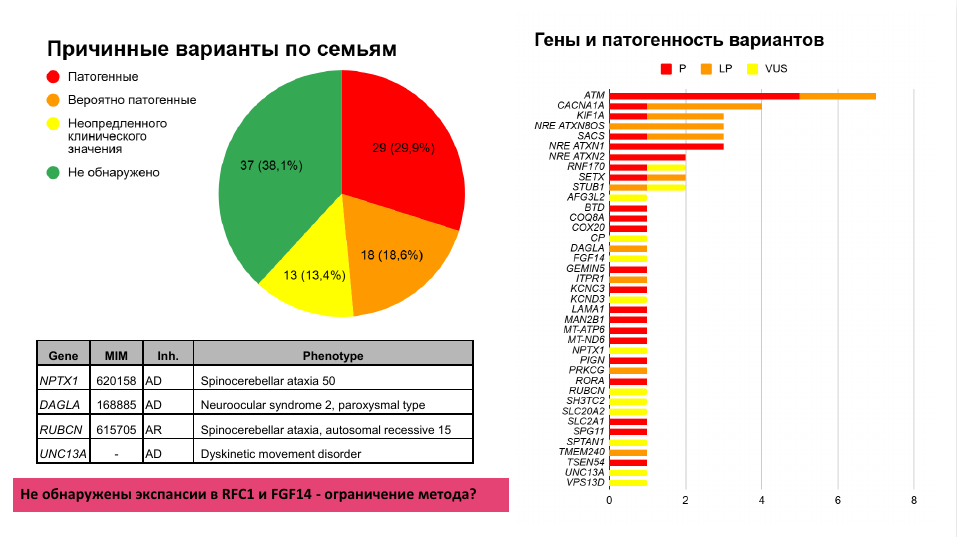 За довольно долгий промежуток времени (с января 2017 года) в НИЦ молекулярной медицины проанализировали 1272 пациентов с симптомами СЦА, которых направили на исследование для установления точного диагноза. Патологическая экспансия подтвердилась у 101 человека (8% случаев), при этом более половины подтвержденных случаев приходилось на 1-й тип СЦА. Также среди пациентов подтвердили два случая СЦА 36 типа — оказывается, она все же существует в РФ!