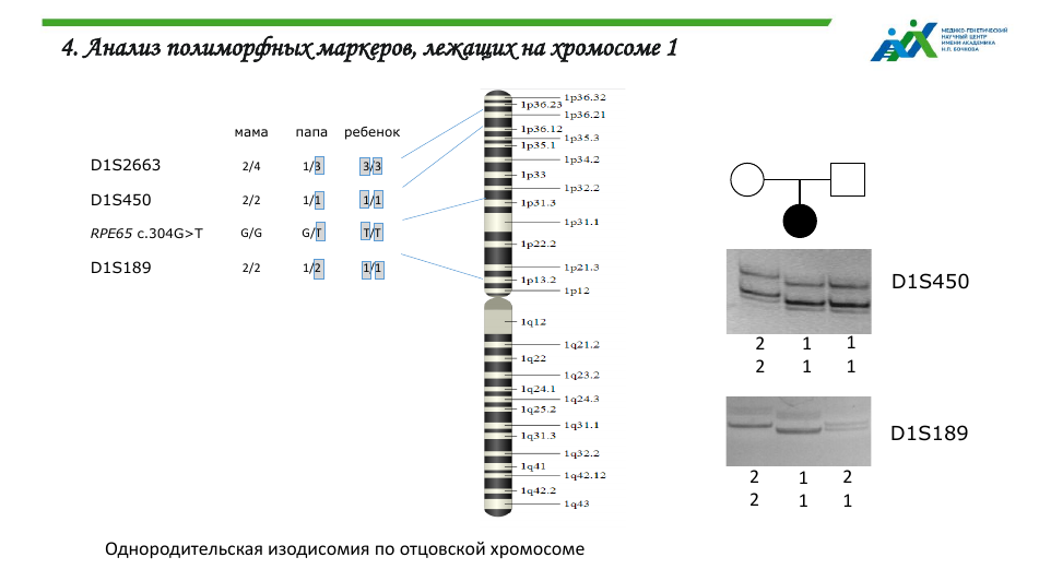 На следующем этапе было подтверждено родство ребенка с обоими родителями, и после этого было выдвинуто предположение об однородительской дисомии. Анализ полиморфных маркеров, лежащих недалеко от гена RPE65, показал, что у больного ребенка отсутствуют аллели материнского происхождения. Это подтверждает предположение об ОРД.