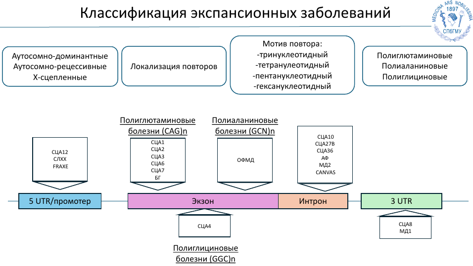 На сегодня описано около 50 болезней экспансий, которые принято классифицировать по типу наследования, локализации и мотивам повторов, по тому, как эти повторы влияют на кодирующую часть.