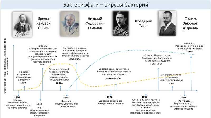 На слайде, посвященном истории изучения бактериофагов (Эрнест Хэнкин, Н.Ф. Гамалея, Фредерик Туорт, Феликс д’Эррель), докладчик отметил оранжевой кривой интерес научного сообщества к бактериофагам. Ожидаемо, он резко упал после открытия антибиотиков, но начал расти по мере снижения темпа разработки новых препаратов и появления антибиотикорезистентности.