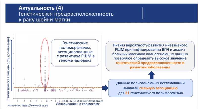 Наследственность — малоизученный и неочевидный фактор риска РШМ. Однако докладчица с коллегами описали примечательный клинический случай: у двух сестер и их матери развилась цервикальная интраэпителиальная неоплазия (CIN3). В медицинской литературе описаны и другие подобные случаи. Их вероятность представляется крайне низкой, даже если все родственницы были заражены ВПЧ (учитывая очень малую долю случаев, в которых инфекция прогрессирует до рака). Тем не менее семейные случаи не настолько редки, что говорит о значительном влиянии наследственного фактора.