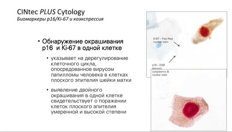 Поскольку р16 также активно экспрессируется в стареющих клетках, дополнительно используют окрашивание на маркер пролиферации ki67. Окрашивание на эти два белка — коричневая цитоплазма и красное ядро — указывает на трансформацию.
