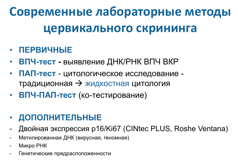 Необходимы недорогие и эффективный скрининговые тесты, в том числе автоматизированные, выполняемые в одной пробирке ВПЧ-тесты. В настоящее время многие зарубежные ВПЧ-тесты ушли из России, но существуют отечественные тесты как для качественного, так и для количественного выявления ДНК ВПЧ.