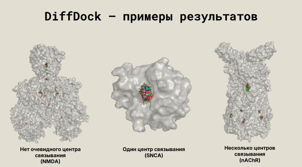 Если сократить количество потенциальных мишеней, скажем, до десятков, то можно использовать структурные методы. В частности, группой докладчика был исследован новый препарат, который представляет собой низкомолекулярное соединение, созданное в лаборатории Новосибирского института органической химии. Это препарат против болезни Паркинсона, который уже дошел до фазы 2b клинических испытаний. И попытались посмотреть, на что воздействует этот препарат, путем молекулярного докинга. Для этого использовали еще один подход из мира искусственного интеллекта, который называется диффузионные модели. При этом сначала добавляют шум, а потом из шума восстанавливают некоторые конечные изображения, используя информацию о том, как низкомолекулярные соединения садятся на некоторые белки.