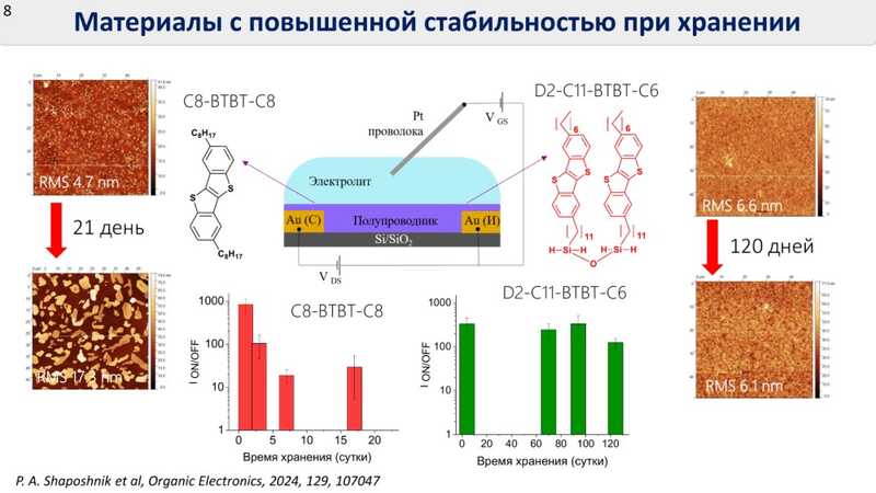 В качестве полупроводников ученые используют аннелированные сопряженные системы, малые молекулы или полимеры. Наиболее перспективное решение — смесь полупроводника с полимерами: такой полупроводниковый слой работает стабильнее и дольше.