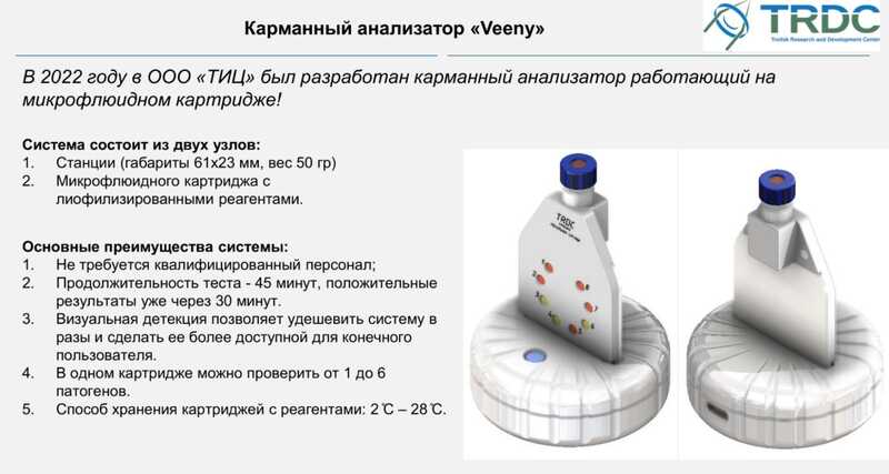 Троицкий инженерный центр — компания полного цикла разработки приборов с собственным опытным производством, основанная в 2013 году. В 2022 году в ООО «ТИЦ» был создан карманный анализатор Veeny, работающий на микрофлюидном картридже. Анализатор состоит из станции весом 50 г с информационным светодиодом и картриджа с восемью реакционными лунками (две из них для контролей). Программа амплификации в приборе длится всего 45 мин, но предварительные результаты можно увидеть уже через 20–35 мин. Детекция сигнала производится визуально: цвет лунки меняется с синего или красного на желтый.