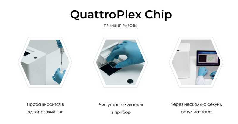 QuattroPlex Chip — более компактная система, которая работает по той же технологии. В этом случае образец вносят в одноразовый чип и помещают в прибор, при этом время анализа составляет всего несколько секунд.