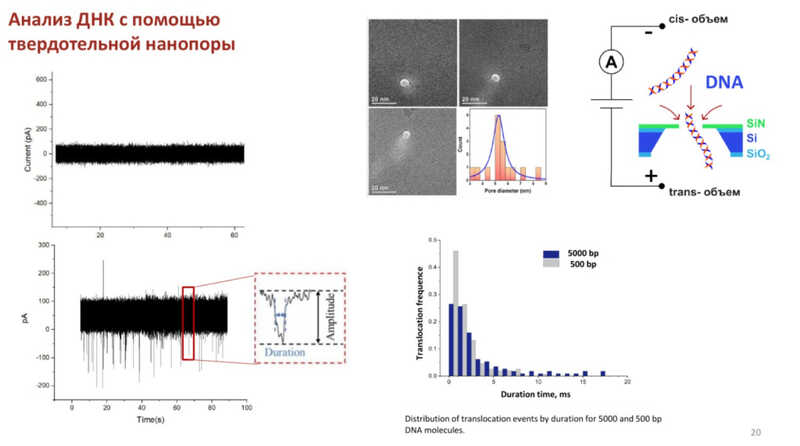 Высокая чувствительность биологических нанопор объясняется их малым диаметром: чем меньше отверстие, тем меньше объект, который можно анализировать. Преимущество же твердотельных нанопор в том, что молекулярно-ионным транспортом внутри них можно управлять, например за счет изменения геометрии поры или ее модификации. Также на проходящие через твердотельную пору объекты можно воздействовать внешним электрическим или оптическим сигналом.