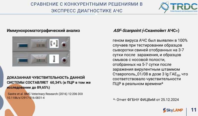 Компания нашла партнера для разработки тест-систем для ветеринарии: особый интерес представляла диагностика африканской чумы свиней (АЧС). Вместе с фирмой SkyLAMP ученые разработали прибор SkyLAMP ScanSpace на 10 картриджей. Для диагностики АЧС использовался картридж ASF ScanPoint, вместе с которым поставляются микропипетки и пробирки для загрузки образцов. Запустить реакцию может неквалифицированный сотрудник: нужно всего лишь взять одну каплю сыворотки, смешать ее с буфером в пробирке и нанести на картридж. В лунках картриджей есть положительный и отрицательный контроль. Длительность детекции — всего 45 мин, но о положительном результате можно узнать уже через 30 мин.