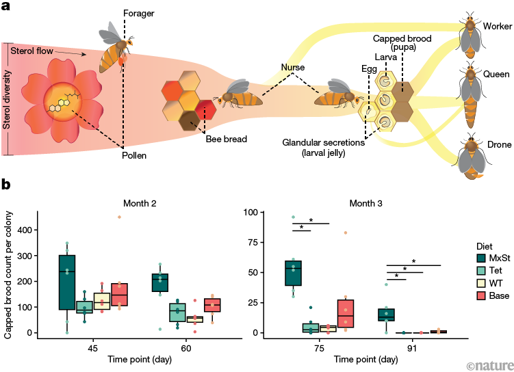 Рабочие пчелы собирают и поедают пыльцу, она также хранится в улье в виде перги. Личинок пчелы кормят маточным молочком — секретом глоточных и верхнечелюстных желез; будущие матки получают молочко все время, будущие рабочие пчелы и трутни только первые три дня. Внизу — сравнение обогащенного стеролами рациона (MxSt), с тремя контрольными по действию на количество печатного расплода (куколок в запечатанных сотах). Credit: Nature (2025). DOI: