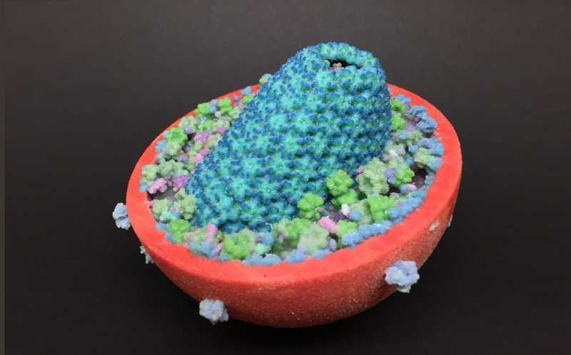 3D-модель частицы ВИЧ в разрезе. Капсид (синий и бирюзовый) окружен липидной мембраной (красный), в которой находятся тримеры Env (сиреневый).