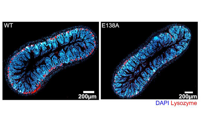 На следующем этапе ученые сосредоточились на клетках Панета. Чтобы выяснить, связано ли снижение уровня лизоцима и других антимикробных пептидов с дисфункцией этих клеток или их отсутствием вследствие нарушения дифференцировки кишечного эпителия, они использовали метод трансмиссионной электронной микроскопии. Количество клеток Панета у трансгенных мышей оказалось таким же, как у здоровых животных. Кроме того, внедрение мутантного варианта гена только в клетки Панета не влияло на их функции, что свидетельствовало о более сложном нарушении межклеточных взаимодействий в эпителиальном пласте (в рамках данной работы, однако, ученым не удалось уточнить механизмы этого сигналинга).