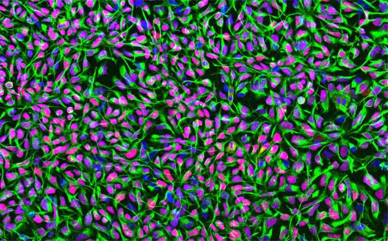 Культивирование нейральных стволовых клеток человека. Ядра клеток окрашены синим цветом, специфичный для нейральных стволовых клеток филаментный белок нестин — зелёным, а транскрипционный фактор нейральных стволовых клеток Sox1 — красным.